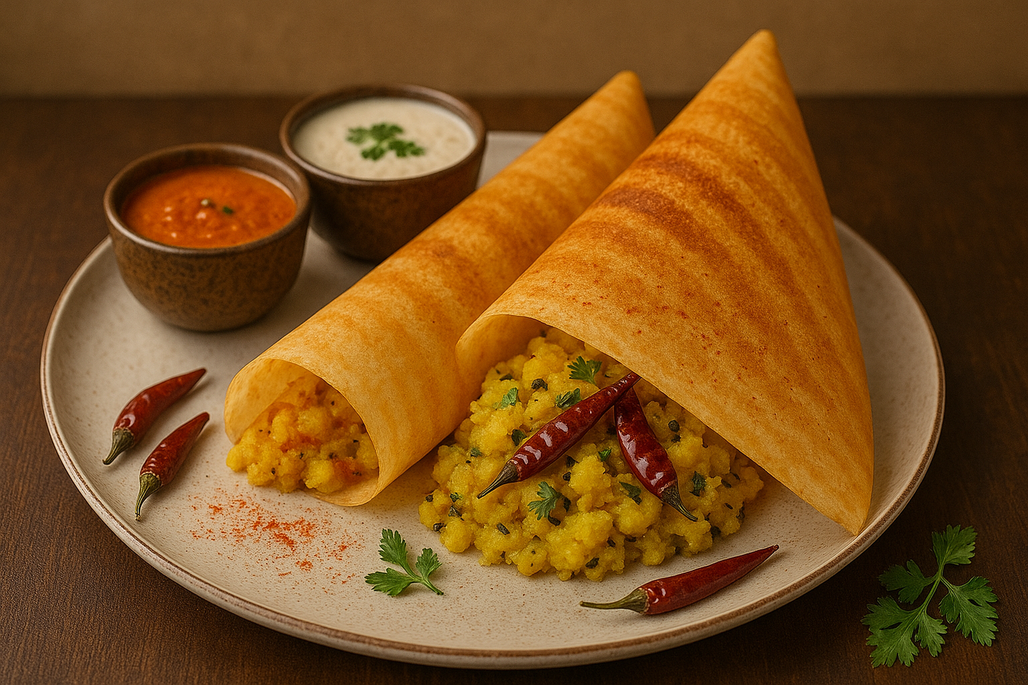 Classic dosa filled with spiced mashed potato, served with sambar and chutneys.