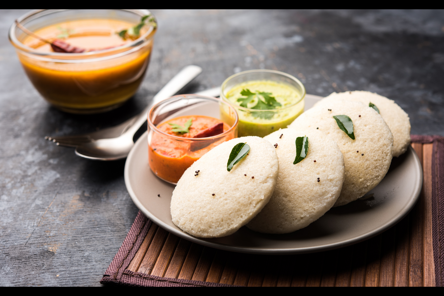 Soft steamed rice cakes served with flavorful lentil-peanut chutney and hot sambar.