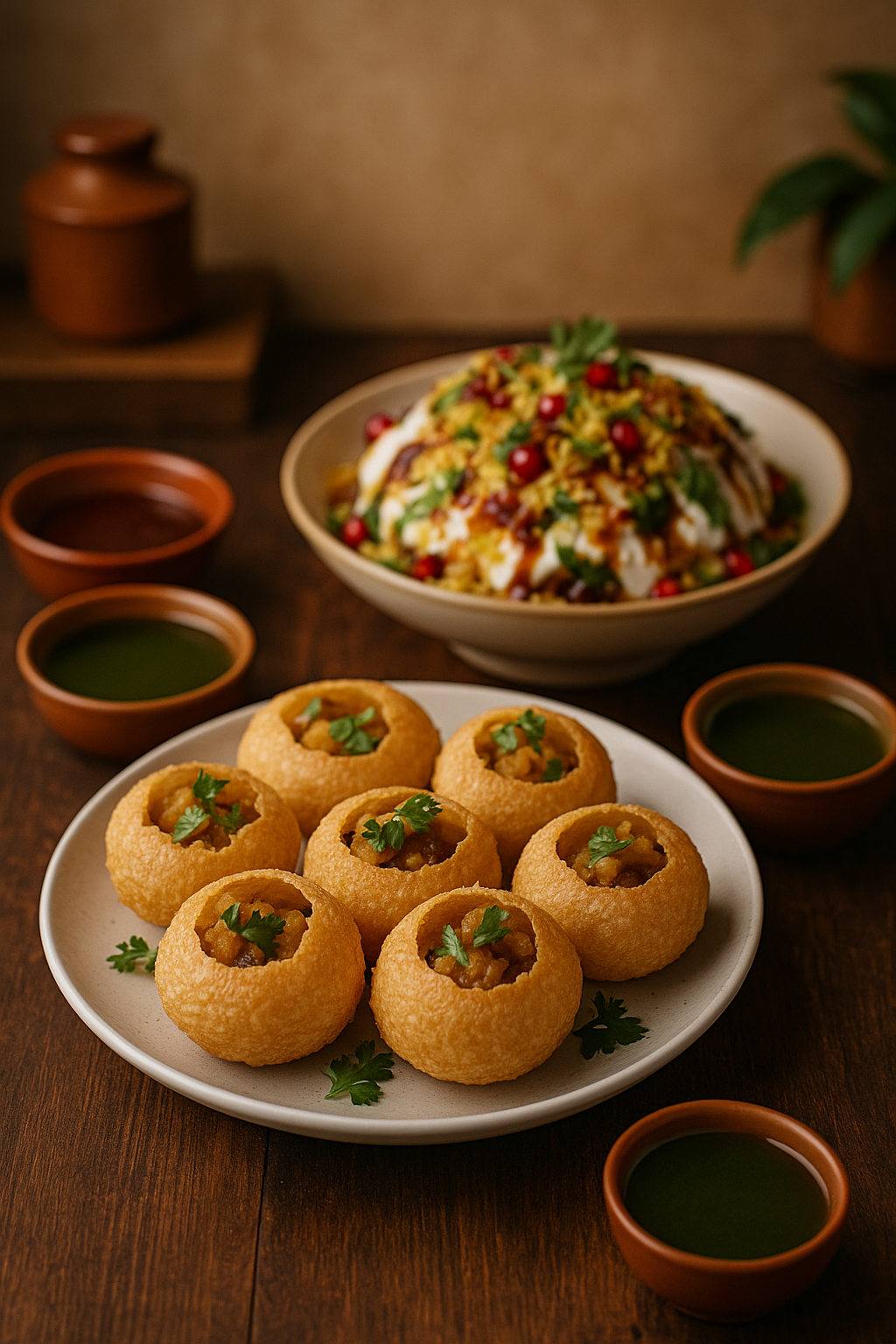 Crispy puris filled with spiced potato and served with tangy tamarind, spicy mint water, and cool yogurt sauce.